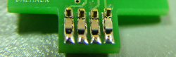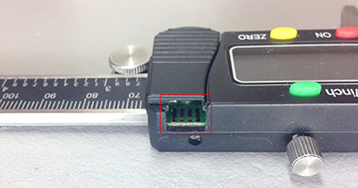The challenge in the hardware design is connecting to the caliper pins. The opening slot is 0.31" wide x 0.4" deep x 0.12" thick. A 0.062" PCB with contacts soldered on that compress to under 0.06" will work. The Digikey part number 1003-1010-1-ND contact works well. The example design PCB looks like this: