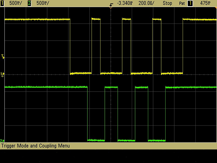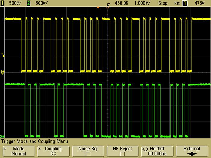 'Trace A' is clock and 'Trace C' is data. The results indicate the clock line goes low, then the data line changes, finally the clock rises and the data is assumed to be clocked in. This is known as "SPI Mode Three". A pecularity in the data is that the data line always returns high on each bit which may draw less current.