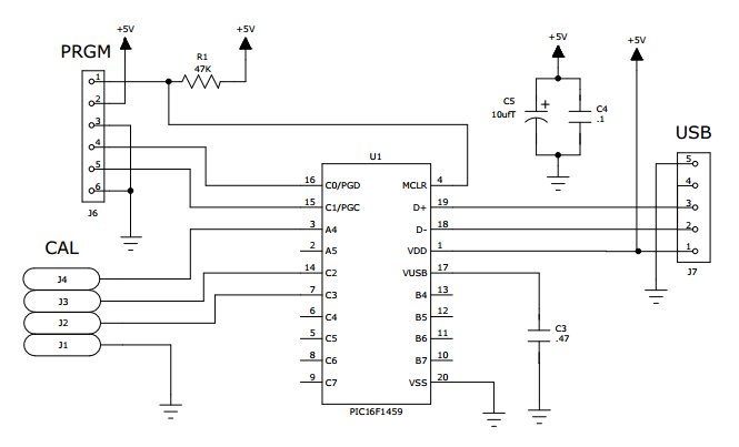 A simple hardware design starts with selecting an inexpensive device such as the PIC16F1459 for its built-in USB. The simple schematic is as follows: