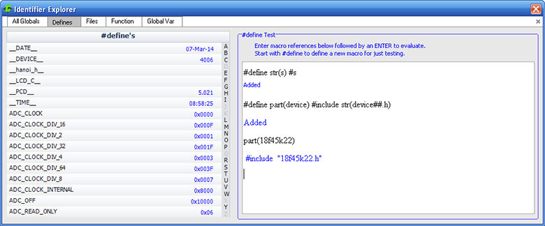 In the "Defines" tab you can test the macros defined in your code and newly defined macros through the ID Explorer. An advantage of this feature is the ability to test your macros without needing to completely recompile or reprogram.