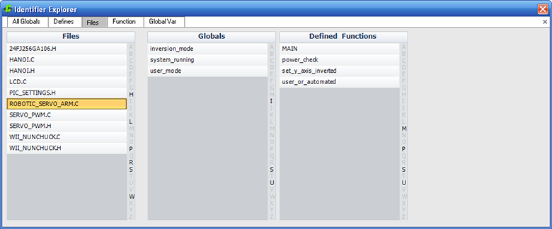 Through the "Files" tab you can easily view "Global" variable and functions in each file of the project. This is handy for locating where all your functions and variables are in the code.