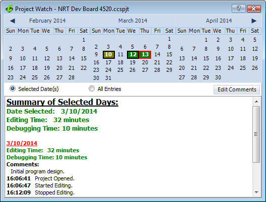 Additionally, comments can be added or modified to a Project Watch log from a pop-up menu by right-clicking on any date that contains log information. Any changes to the comments will be saved to the project log and displayed in the log information window. The Project Watch feature is available under the 'View' ribbon in the IDE.