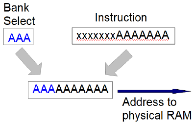 When x (the access bit) is 1 the address in the instruction is combined with the bank select bits to form the physical address.