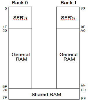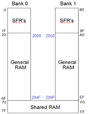 Even the old PIC chips had some special function registers duplicated in every bank, so there is no need to switch banks to access a popular register, like the status register. Many of the newer PIC ® MCUs also have some general purpose RAM duplicated in all the banks. For example, on the PIC16F887 locations 0x70-0x7F reference the same RAM locations regardless of the bank bit setting. That means 0x70 and 0x1F0 are the same location. It is for this reason the compiler scratch locations begin at 0x70.