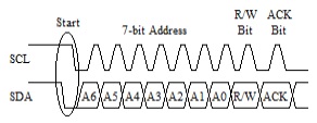 All I2C communication is started by the master device by it doing an I2C start on the bus, pulling the SDA pin low while both pins are high and then pulling the SCL pin low. Generally there is only one master device on the bus, however there is a multi-master version of the I2C protocol which is beyond the scope of this article. Next the master clocks out the address bits, there is a 7-bit address and 10-bit address protocol, 7-bit addresses are typically used in microcontroller applications so this article will focus on them. After the 7-bit address has been clocked, the read/write bit is clocked out by the master. If the read/write bit is pulled low the master is writing data to the slave and if it is high, the master is reading data from the slave. Finally following the read/write bit the master will clock in the acknowledge (ACK) bit. If a slave device acknowledges the address it will pull the SDA pin low during the ACK bit, or if no slave device acknowledges the address the SDA pin will be left to float high during the ACK bit. The following is a diagram showing what the I2C start and address bytes look like: