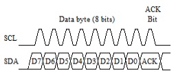 Assuming a slave device acknowledges the address byte the master will then clock out or clock in the data bytes. This is done by the master clocking 8 data bits followed by an ACK bit. If the master is writing data to the slave device, the master controls the SDA pin during the 8 data bits and the slave controls the SDA pin during the ACK bit. If the slave acknowledges the data byte it will pull the SDA pin low during the ACK bit and if it does not acknowledge the data byte, it will allow the SDA pin to float high during the ACK bit. If the master is reading data from the slave device the slave controls the SDA pin during the 8 data bits and the master controls the SDA pin during the ACK bit. The master uses the ACK bit during reads to signal the slave device if it will be reading more data or not, the master pulls the SDA pin low during the ACK if it has more data to read from the slave device and lets the SDA pin float high during the ACK if it done reading data from the slave device. The following is a diagram showing what the I2C data read and write bytes look like: