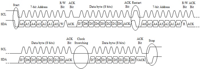 A couple other features to know about the I2C protocol is and I2C restart or repeated start and clock stretching. The I2C restart is done by the master first setting the SDA line high then letting the SCL line go high and then pulling the SDA line low again. The restart is used in cases were a master is reading or writing data to or from a slave device and then wants to switch the operation it is doing for the same slave device. An example of when a restart may be used is when reading data from a random address from an external EEPROM, the master would first write data to the EEPROM to set the address in the EEPROM memory it wants to read from and then do a read to read the data from that address.